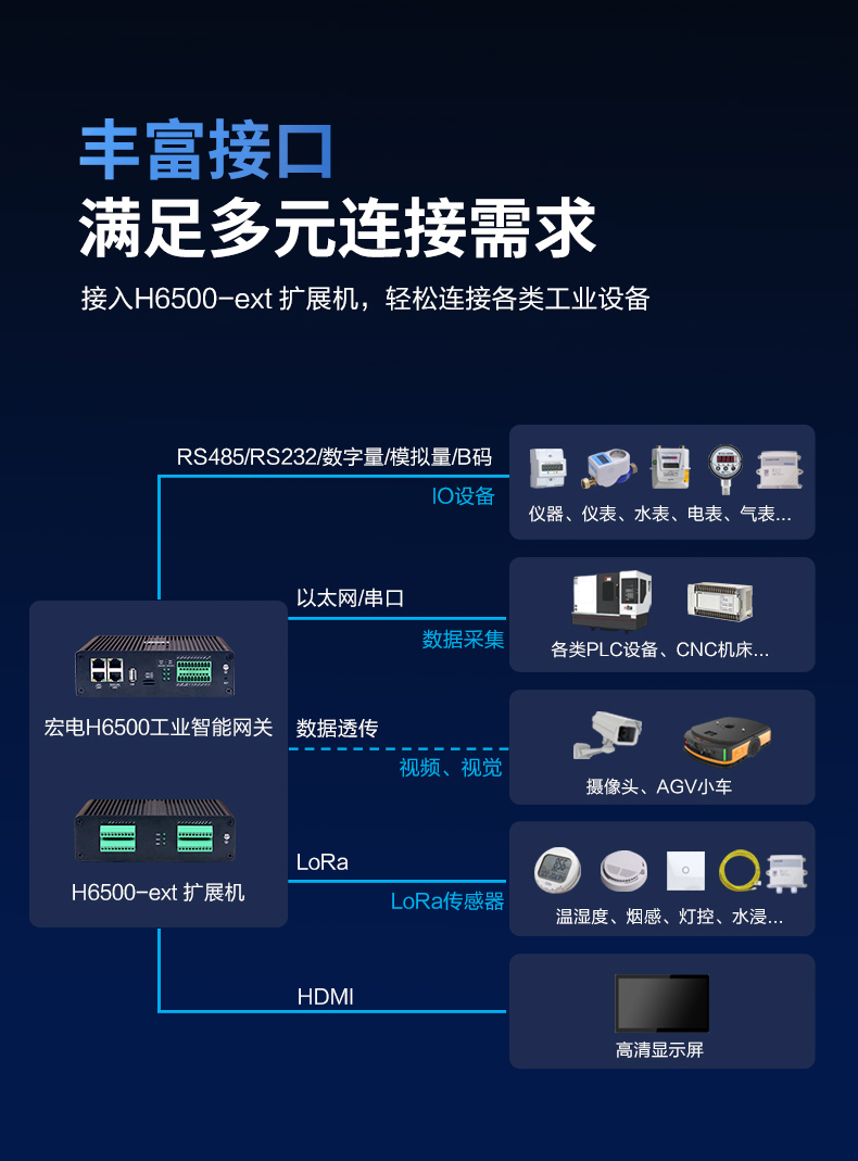 1*VCC-OUT、4*DI输入、2*继电器输出、6*RS-485、2*电流AI,2*电压AI、1*CAN、4*GPIO |
