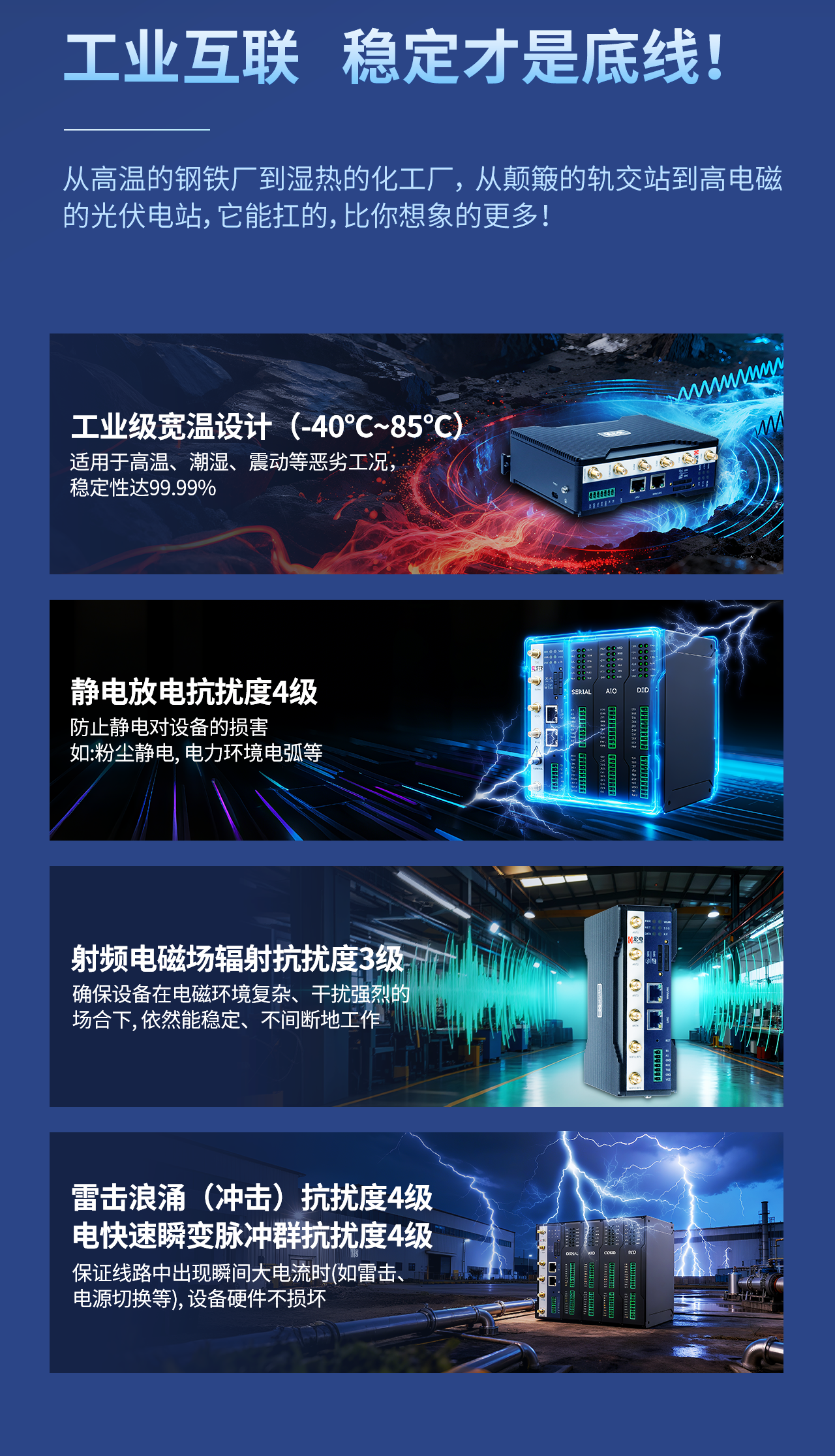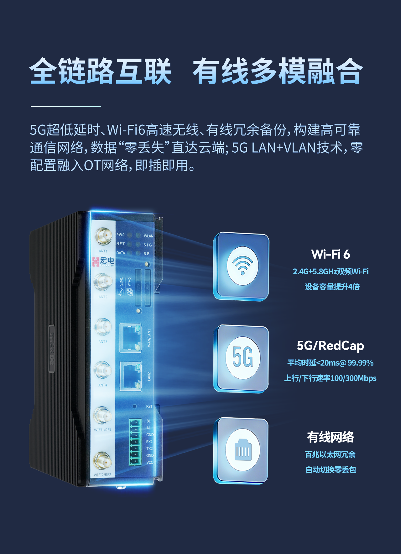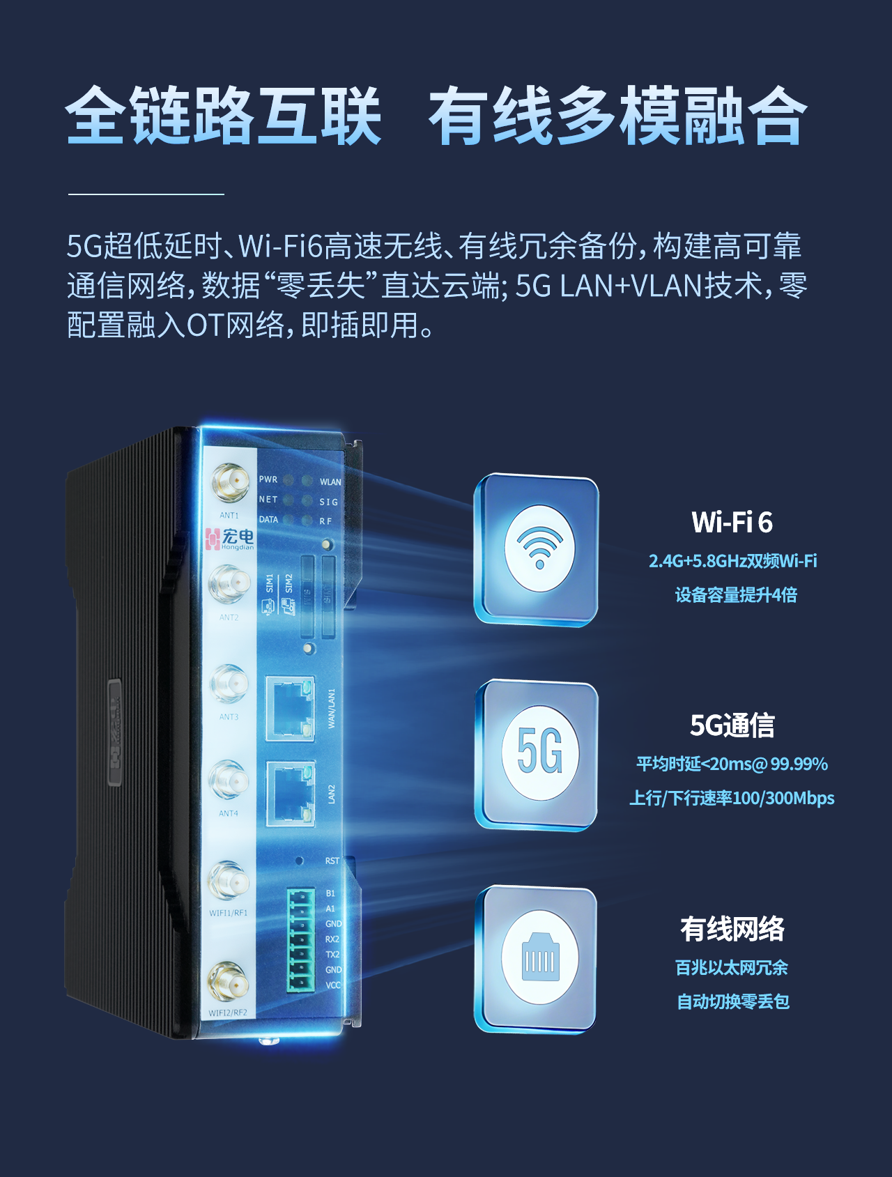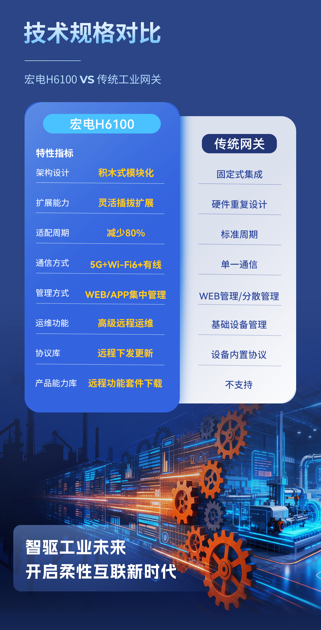 宏电H6100⼯业智能⽹关是⼀款基于国产化⽅案的智能⼯业⽹关,旨在解决传统⼯业⽹关功能单⼀、云边协同能⼒不⾜及定制化周期⻓等问题。该产品采⽤开放式软件架构设计,⽀持5G/4G、WiFi6、有线等多种通信⽅式,设备可通过积⽊式扩展模块灵活适配不同接⼝需求(如RS485、CAN总线、AIO/DIO等),并集成边缘计算能⼒,实现本地数据实时分析与智能化处理。采⽤⼯业级标准设计,宽温、抗强电磁⼲扰,确保在恶劣环境下稳定运⾏。可选国⽹加密功能。可应⽤于⼯业数据采集、城市管⽹监测、⽔⽂监测、泵站状态监测、燃⽓场站安全⽣产监测、智慧交通管理等场景。