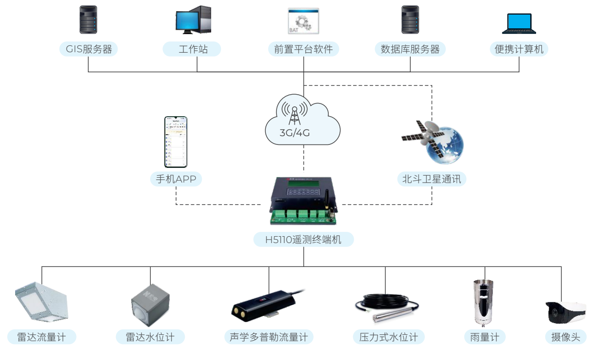 支持雨量、水位、水温、流量、流速、位移、闸门开度及蓄电池电压等数据