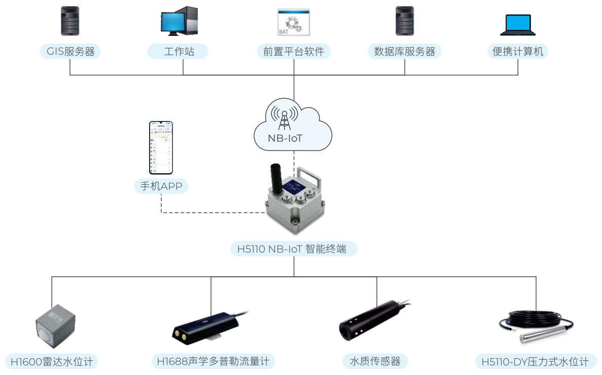 H5110 NB-IoT智能终端具备水位/流速流量/水质要测采集和无线通讯功能于一体,可以在泡水环境(0.5m以内,非腐蚀性环境)长期稳定工作的智能采集传输终端。