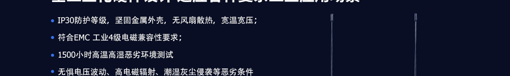 IP30防尘、EMC3级或4级标准、100-240V宽压、无风扇散热、抗跌防震 |